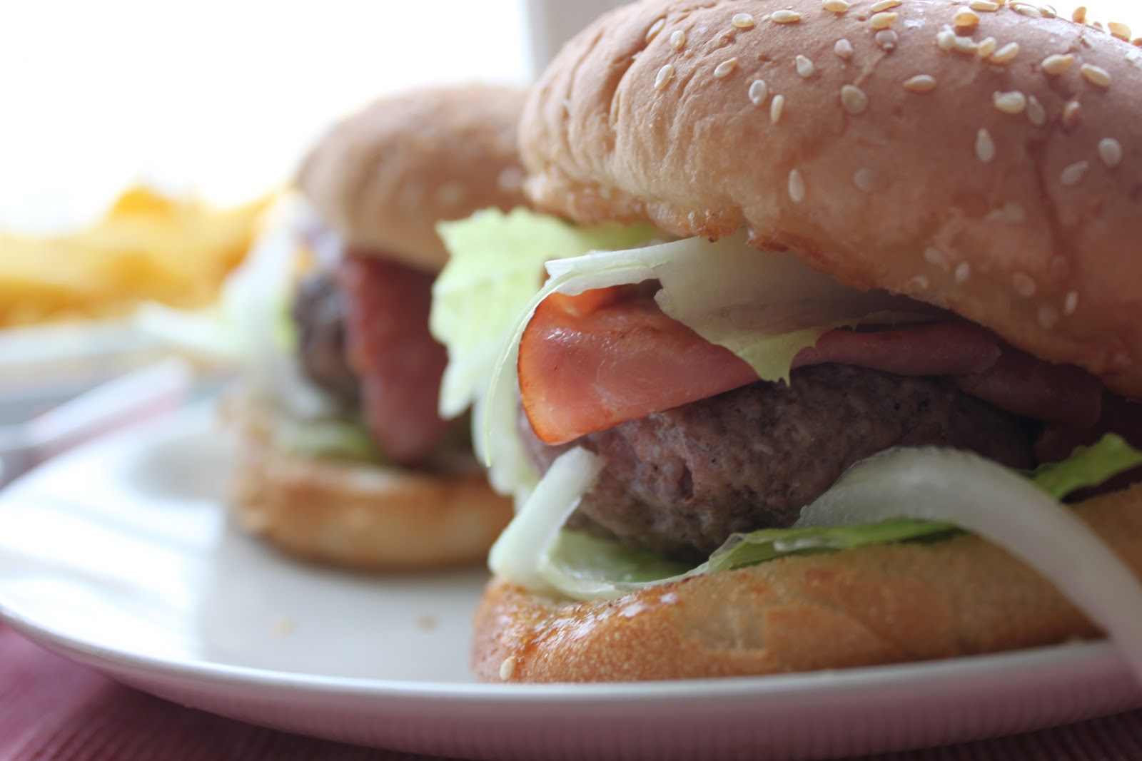 Dana ve koyun kıymasını eşit oranda karıştırın.Köftenin içine hiçbir şey eklemeyin sadece,tombulca yapın ve kızgın tavaya koymadan üzerine bol tuz ve karabiber ekip sıvazlayın (içine tuz koyarsanız suyunu çeker). Sonra burgerinizin içine füme salam, kaşar, marul, soğan, domates ne isterseniz koyun.